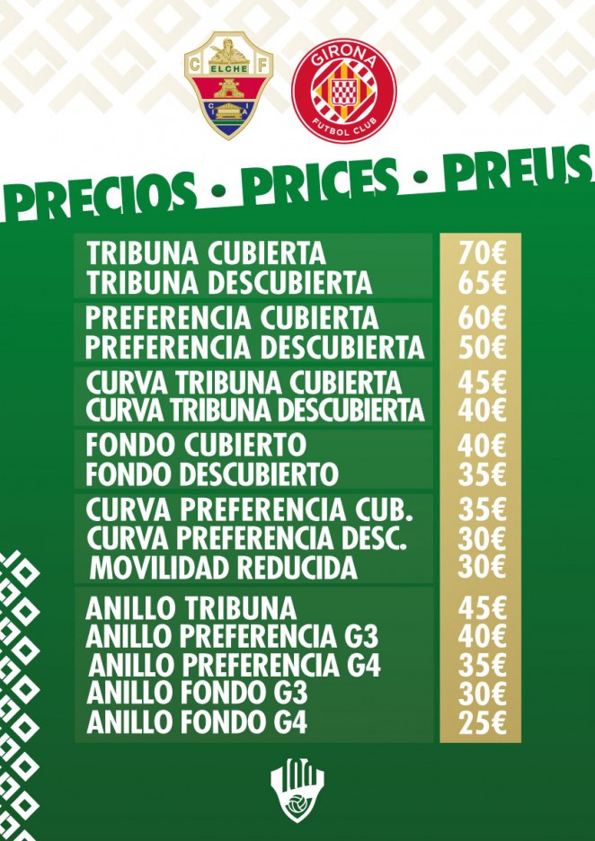 El Elche C.F. recibe el próximo martes 8 de noviembre, a las 19.00 horas, al Girona F.C. en el estadio Martínez Valero en la jornada 14 de LaLiga Santander. Los abonados franjiverdes de esta campaña podrán acceder al partido con su abono, mientras que para el público general el Club ha establecido los siguientes precios y podrán ser adquiridas de forma online pinchando aquí.